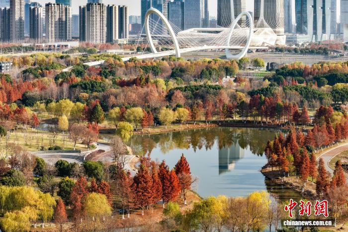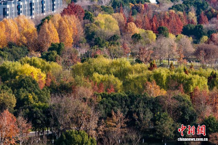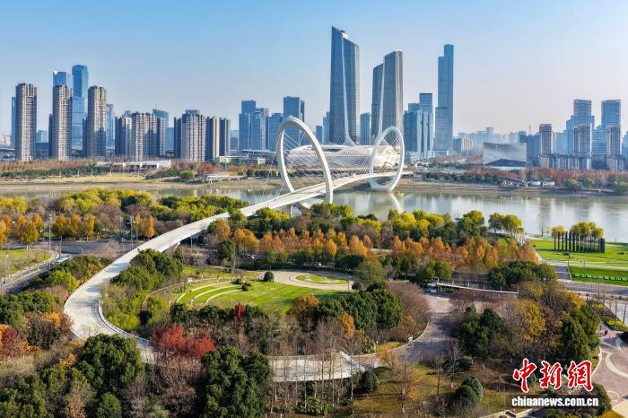 12月16日,航拍位于少江中的北京市修邺区江心洲青奥丛林花园,天然肌理取乡市天空线相照应,“画便”冬季里的死态图景。(无人机像片)中新社记者 泱波 摄